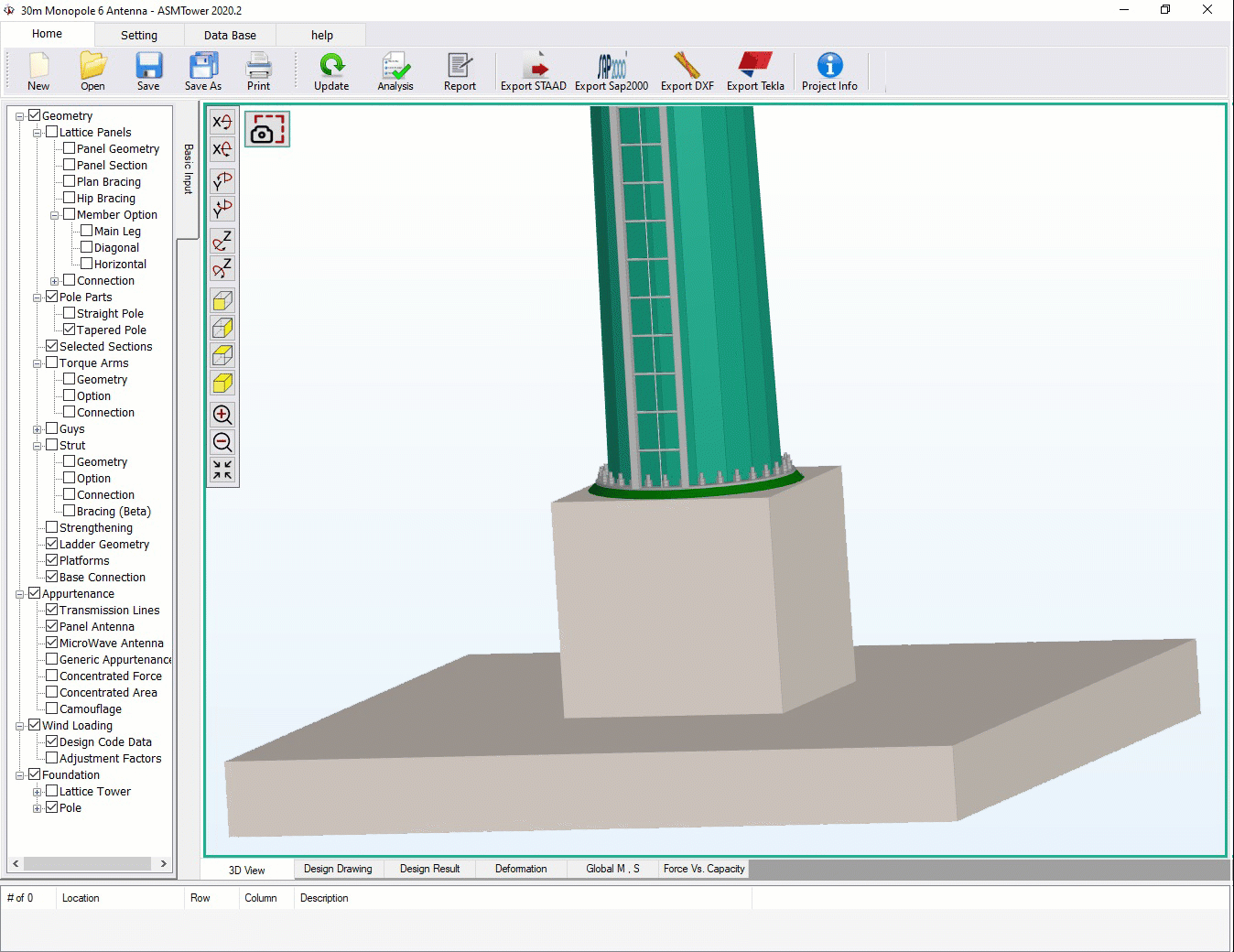 You can analysis and design different types of structures such as tapered/stepped monopoles, lattice towers, guyed masts, guyed poles and strut (bracketed) masts or poles. ASMTower calculates all required data from structure loading, linear/nonlinear analysis, buckling lengths, effective buckling length, member strength, bolt strength, anchor bolt strength, anchor development length, foundation analysis, foundation stability checks, interaction diagrams for RC columns, and prepared 3D model in Tekla to prepare shop drawings.